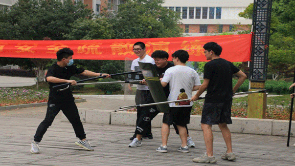 第四是防暴演练,我系保卫部同学借来了保安防暴道具,为同学们模拟突发暴恐事件的应对方法。