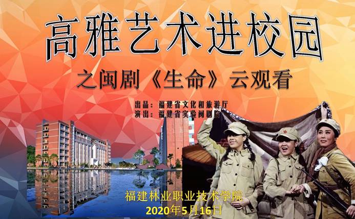 高雅艺术进校园活动是校园文化活动重要组成部分,2020年5月16日,福建林业职业技术学院全院师生在线观看了闽剧《生命》,在进一步促进校园文化的繁荣与发展,丰富校园课余文化生活的同时,也为同学们弘扬中华传统文化,传承戏曲经典,感受闽剧魅力提供了一个良好的平台。