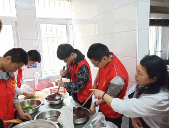 建筑工程系师生志愿者抵达开智学校后,筑梦小分队负责人王汉强同学首先对现场人员进行了具体的任务分工。由于此时正是开智学校的午休时间,志愿者们便先行来到厨房,开始紧张有序的食材准备工作。在罗煌璋同学的带领和后勤阿姨的指导帮助下,志愿者们分工协作,有条不紊地进行着洗菜、切菜、捣馅,擀面等备料工作。开智学校的小朋友们午休结束后,在老师的带领下纷纷来到教室,他们对志愿者哥哥姐姐的到来感到无比欣喜,亲切热情地打着招呼。