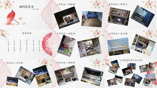 除宿舍形象展示外,本期宿舍文化节活动的另一个主题是分享交流来自职业整理专家近藤麻理惠的畅销书籍《怦然心动的人生整理魔法》与此书籍改编的同名电影。5615宿舍根据书籍,现场教授同学们收纳顺序与如何正确叠放衣服的每个步骤;6720宿舍归纳了整理心得,“整理是一种情感的活动,是一种人生态度,使我们明白什么叫足够,真正的人生始于整理之后”;6723宿舍开心告诉大家“你认真努力的样子最漂亮”,5705与5706宿舍结合实践分别谈到“自律才是一切整理得根源”、“好的习惯将伴随人并一生受益”……