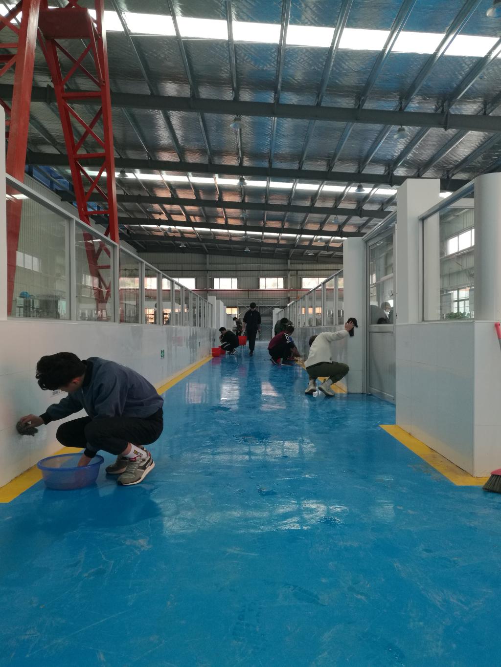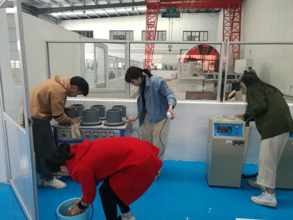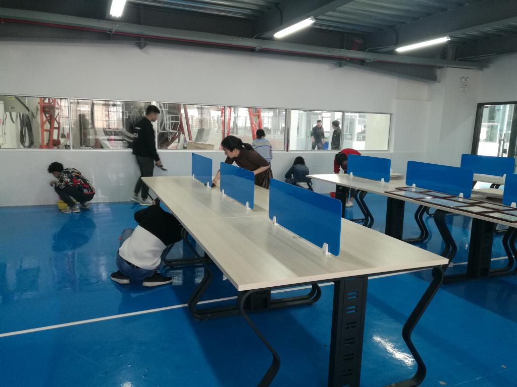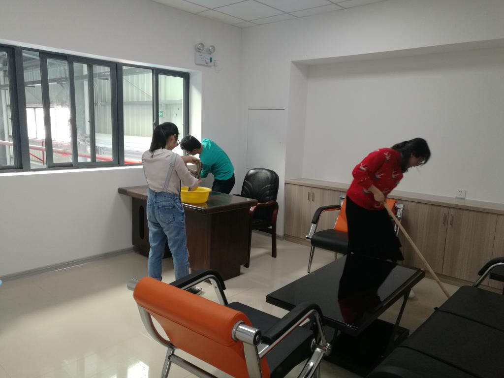 党总支书记孙华首先对在场的党员同志们进行分工和部署,并提出了清理的要求,强调大家注意安全,认真清扫。在明确了区域划分和任务之后,大家迅速投入到清扫当中。党员同志们脱了外套,挽起袖子,有的拿起桶来接水擦玻璃、抹桌子,有的拿起扫把打扫尘土和垃圾,有的抡起拖把拖地面,有的合力摆放仪器……亮洁的玻璃映出党员们通红的笑脸,干净的地面让实训馆更加亮堂。党员们不顾脸颊的汗水及身体的疲惫,团结协作,有条不紊,使整个实训馆焕然一新。
