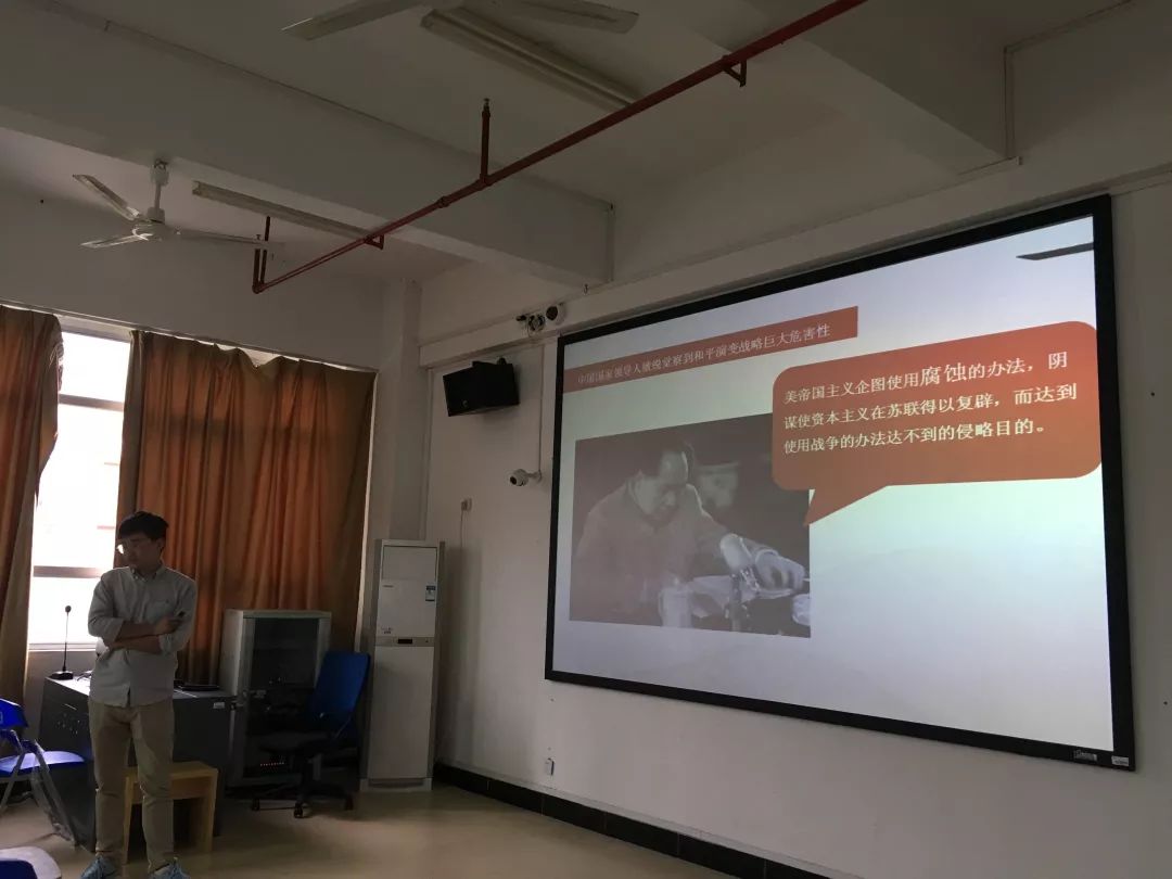 首先应老师为同学们解释“意识形态”的含义,接着从东西方意识形态斗争的由来及演变、我国当前面临的意识形态渗透挑战、提升大学生党员自身的意识形态能力等方面展开,通过同学们身边的生动案例、网络大v事件、历史溯源、流行电影等,为同学们深入浅出的讲述问题本质。