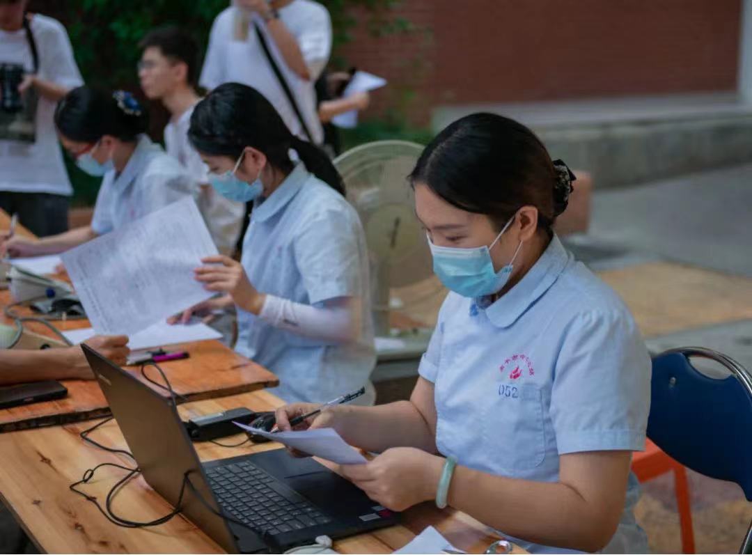 正式抽血之前,工作人员引导献血者填写健康情况征询表,为了确保每位同学的身体状况适合献血,医生为参与献血的学生进行基本的体检。(量血压、测心率、采集血样)