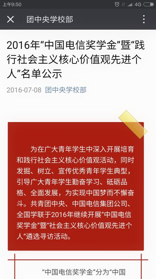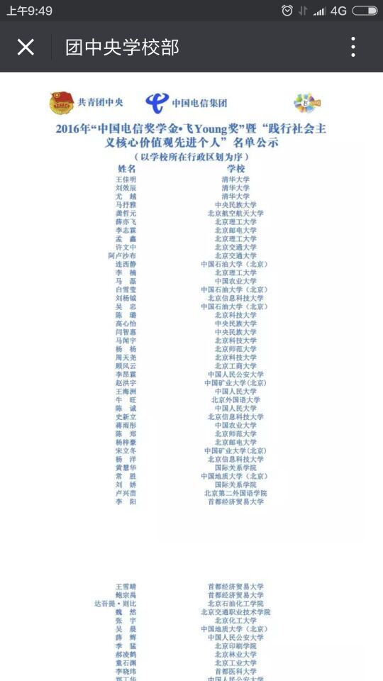 “中国电信奖学金·飞Young奖”暨“践行社会主义核心价值观先进个人”系共青团中央、中国电信集团公司、全国学联联合设立“中国电信奖学金”,旨在为在广大青年学生中深入开展培育和践行社会主义核心价值观活动,同时发掘、树立、宣传优秀青年学生典型,发挥示范引领作用,引导广大青年学生勤奋学习、砥砺品格、全面发展,为实现中国梦而不懈奋斗,对优秀大学生进行表彰奖励。本次院团委共推荐了2名学生申报中国电信奖学金。