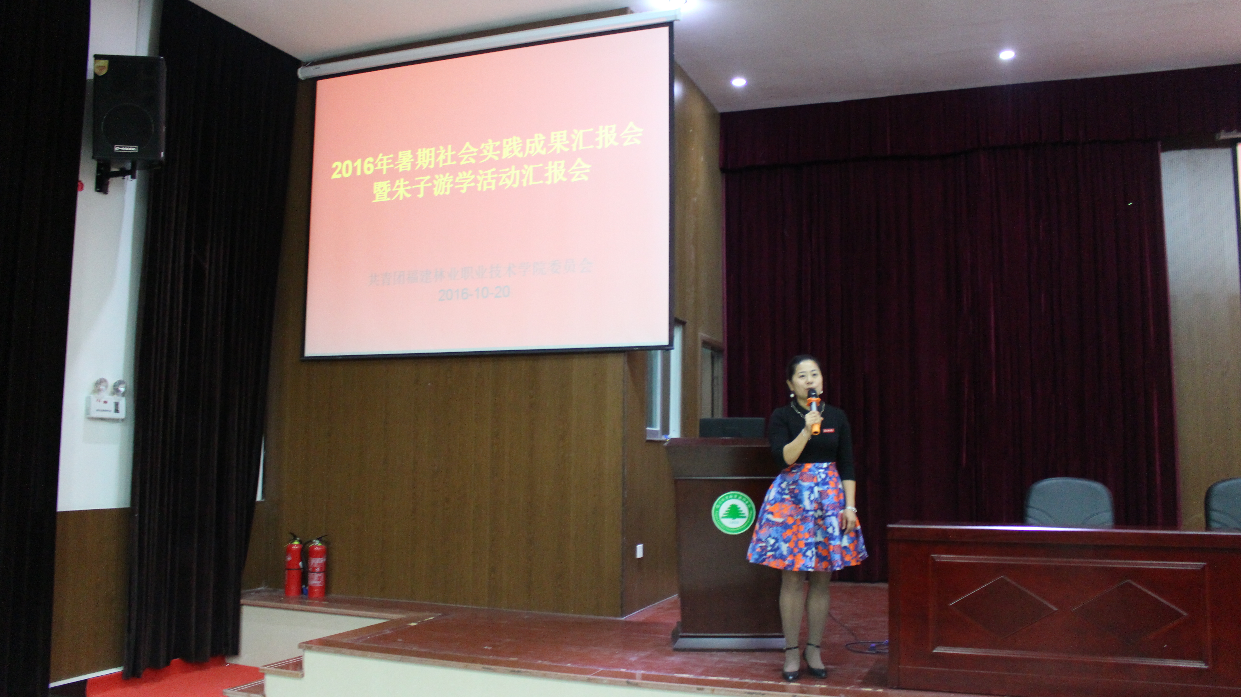 为展示社会实践成果,交流分享实践经验,引导和帮助广大青年学生在社会实践中受教育、长才干、作贡献,2016年10月20日晚上7点30分,院团委在江南校区礼堂隆重举行了2016年暑期社会实践成果汇报会暨朱子游学活动汇报会,团委副书记李霞老师、经济管理系学生科长陈友益老师、艺术设计系学生科长杨自绍老师、各系团总支负责人、各系小分队成员及各系观摩学生等约300人出席此次活动,会议有团委叶新颖老师主持。
