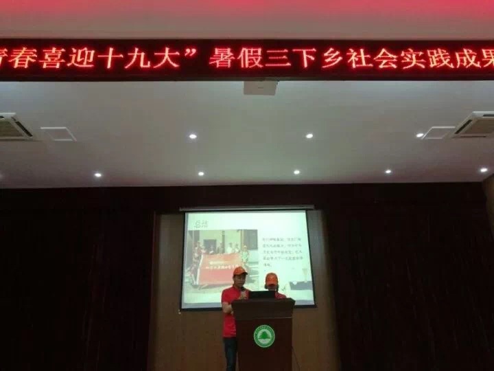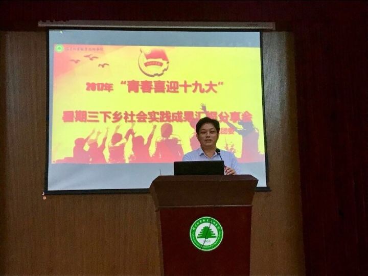 为促进我院学生全面成长成才,喜迎党的十九大胜利召开,2017年10月17日晚7时,院团委在江南礼堂组织开展了以 “青春喜迎十九大”为主题的暑期三下乡社会实践成果汇报分享会,院党委副书记陈洪尧亲临现场并发表重要讲话。林学系党总支书记吴奇镇、建筑工程系党总支书记王云彪、艺术设计系党总支书记、系主任成榕、经济管理系党总支书记谢福荣、自动化工程系党总支副书记范有福、园林系党总支副书记陈剑勇、学生处副处长、团委副书记李霞及各系团总支负责人,各实践队指导老师、各系学生代表共三百余人参加了此次活动。