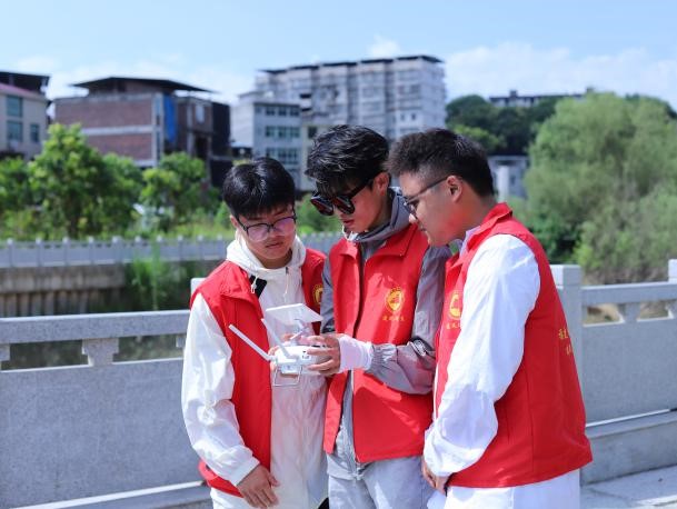 此后,实践团前往峡阳镇的河长制主题公园参观。在当地水利站站长梁福庆的引导下,团队成员详细了解到峡阳镇持续推进河长制工作,通过旱厕改造、农村污水管网完善、畜禽养殖污染防治等措施,不断改善生态水环境,助力乡村振兴发展。团队还利用无人机测绘公园设施,深入了解当地政府创新河湖管理机制,由“治水”向“智水”转变的做法。