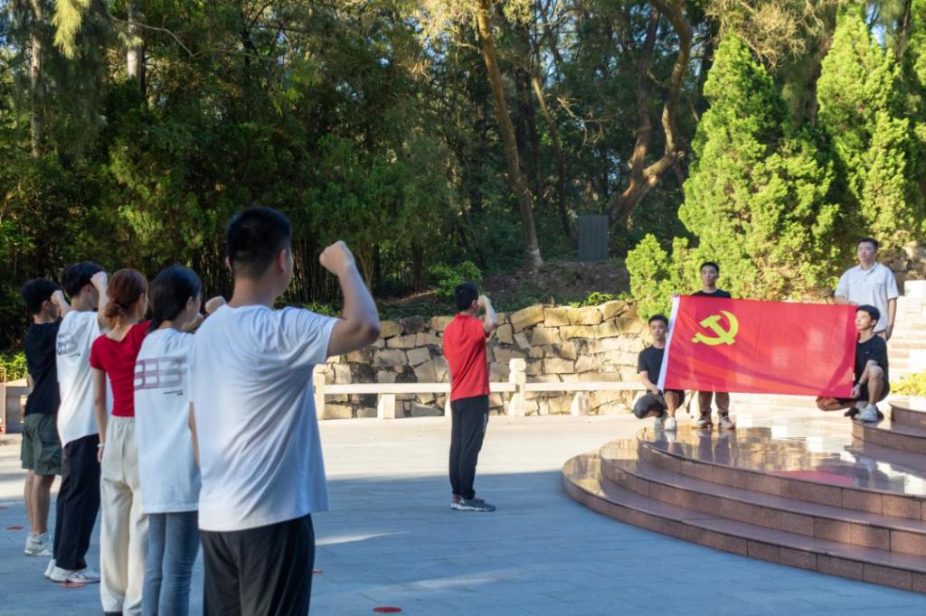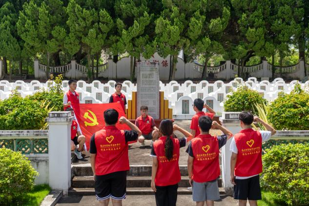 随后,实践队员们来到了烈士公墓。这里安葬着许多为国捐躯的先烈们,他们的墓碑静静地排列着,仿佛在诉说着那段悲壮的历史。实践队员们整齐地列队站在墓前,吴文杰老师带领着“长青”实践小分队党员举起右手,庄严地重温入党誓词。声音铿锵有力,回荡在广场上空。誓词中的每一个字都充满了力量和信念,它们不仅是对党的忠诚誓言,更是对先烈们的崇高敬意和承诺。