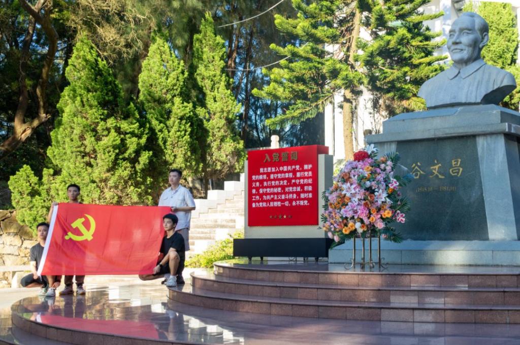 在谷文昌同志纪念铜像前,“长青”实践小分队的队员们庄严肃立,他们怀着无比崇敬的心情,向谷文昌塑像深深鞠躬,敬献花篮,以此表达对谷文昌同志的深切缅怀。在吴文杰老师的带领下,队伍整齐划一,党员们高举右拳,在纪念碑前,面对着鲜红的党旗,再次重温入党誓词,以此深情地缅怀那位被习近平总书记誉为“在老百姓心中树起了一座不朽的丰碑”的“四有”书记谷文昌。