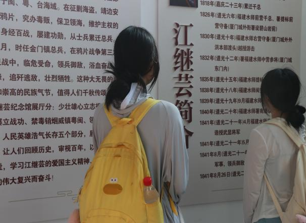 实践小队首站来到了江继芸纪念馆。江继芸为“福建抗英第一人”,为禁毒事业做出了巨大的贡献,他生于平潭水师世家,熟悉水性,少壮雄心,习武报国。1841年,在第一次鸦片战争厦门保卫战中壮烈殉国。
