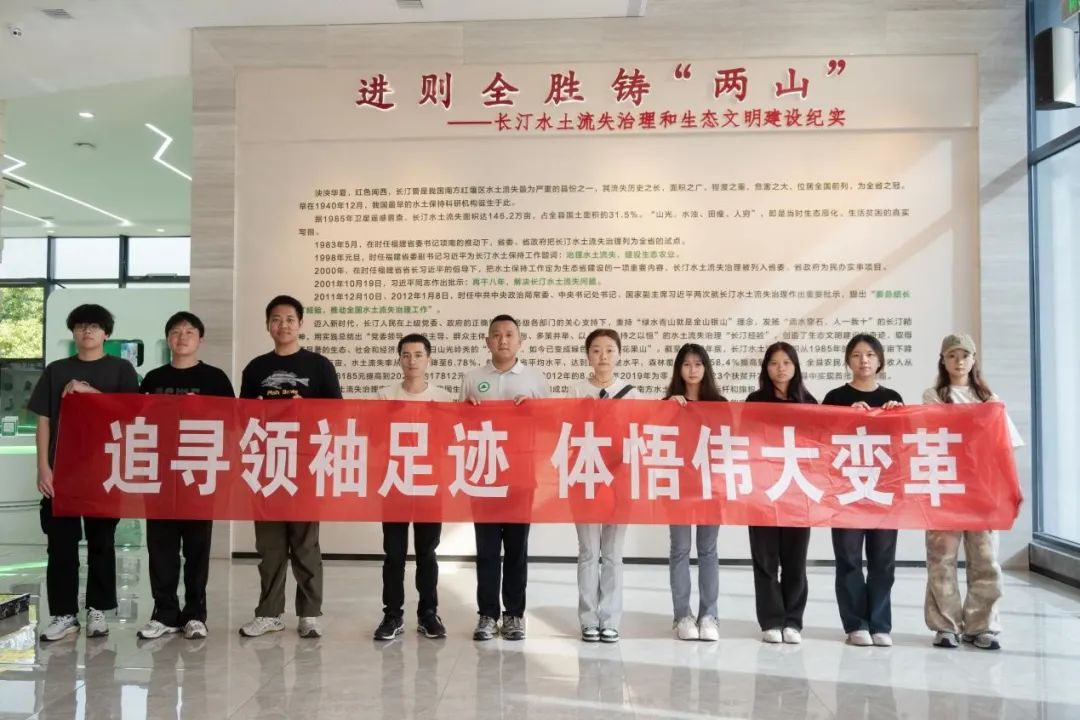 7月9日下午,志愿服务队走进长汀县水土保持科教园,深入了解这片曾经饱受水土流失之苦的土地转变为生态文明典范的艰辛历程。在讲解员的带领下,队员们参观了科教园的保育区、恢复区、合理利用区、宣教展示区及管理服务区,通过丰富的图文资料和生动的讲解,感受到长汀县从“不毛之地”到“绿满山川”,再到“金山银山”的历史转变。随后,全体成员来到习近平总书记亲自栽种的香樟树前,聆听“一棵香樟树”的故事,感受领袖心系民生福祉的魅力,让成员们更加深入地了解水土保持的重要性。