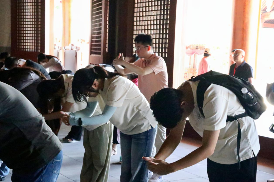 队员们首先走进朱子文化园,园内奎文阁飞檐斗拱,雕梁画栋,传统建筑美学在现代修缮中得以重生。驻足阁前,队员们聆听当地文化学者讲述奎文阁作为古代文人讲学、藏书之地的历史,感受“文以载道”的文化传承。在集成殿内,队员们整理衣冠,向朱熹塑像行三鞠躬敬师礼,在庄严肃穆的仪式中与先贤进行跨越时空的精神对话,体悟“格物致知、诚意正心”的治学与修身之道。