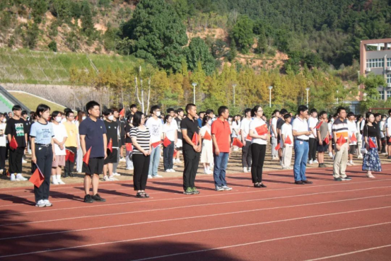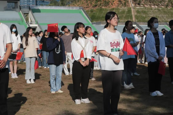 本网讯 金秋送爽喜迎二十大,丹桂飘香共祝祖国好。10月1日上午,我院在江南校区田径场隆重举行2022年国庆节升旗仪式,院党委副书记严绍裕、各系党总支书记、各系团总支书记、团委工作人员及部分师生代表近千人参加升旗仪式,共同庆祝中华人民共和国成立73周年。