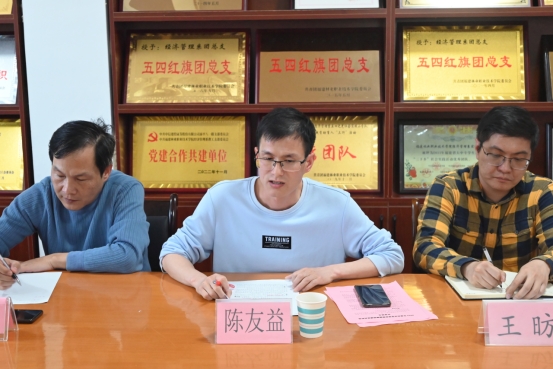 会上,经济管理系党总支书记陈友益就师德师风重点工作进行部署。陈友益强调,一要提高认识。深入学习习近平总书记关于师德师风建设的重要指示精神,严格遵守新时代教师职业行为十项准则,深刻领会在新时代加强师德师风建设的重大意义,将思想和行动统一到学院工作部署上来。二要遵纪守法。要以案例中的事件为反面教材,做到举一反三,时刻自重、自省、自励,坚守廉洁自律,规范从教行为,做一名清正廉洁的高校教师。三要实干担当。要牢记“空谈误国,实干兴邦”,坚持干字当头才能把全面建设社会主义现代化国家的美好蓝图变成现实。每位教师要自觉增强立德树人、教书育人的荣誉感和责任感,敢于担当、善于作为,要将廉洁文化建设与落实立德树人根本任务紧密结合,争做有理想信念、有道德情操、有扎实知识、有仁爱之心的“四有”好老师。