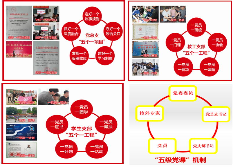 2.在党支部层面,实施教工支部“五个一工程”(一党员一班级、一党员一协会、一党员一课题、一党员一赛项、一党员一门课)和学生支部“五个一工程”(一党员一团学、一党员一帮扶、一党员一活动、一党员一计划、一党员一证书),有效发挥党支部强化党员教育管理、做好思想政治工作、服务广大师生员工的作用。