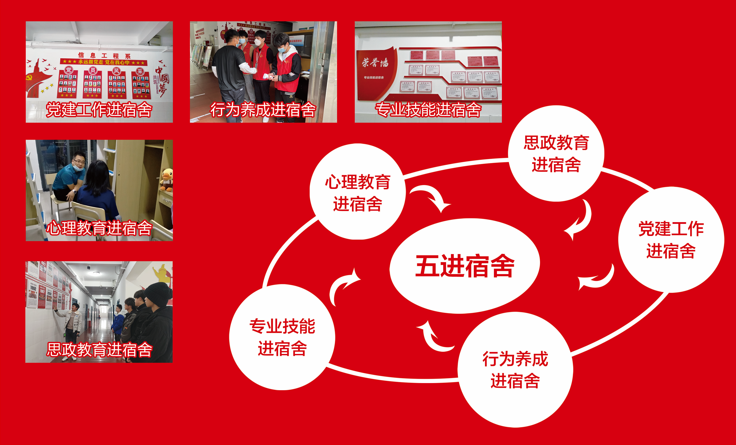 3.着力创新全过程育人载体。一是上好入学第一课。建立“新生开学第一堂思政课”,引导大学生“扣好人生第一粒扣子”。二是建好实习期间思政工作机制。推行学生党员顶岗实习“互联网+思政、朋辈1+10、思政导师制”的思政模式和学生党员顶岗实习“八个一工程”,即一次组织谈话、一份思想汇报、一次组织生活会、一次专题党课、一党员一考核、一实习一总结、一季度一汇报、一月一活动,做到“党员走到哪里,支部建到哪里”。三是占好宿舍思想阵地。实施“五进宿舍工程”,即思政教育、党建工作、行为养成、专业技能、心理教育进宿舍,落实落细“三全育人”。