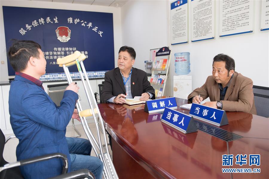 浙江省湖州市吴兴区八里店镇司法所工作人员在调解一起工伤纠纷事件(2019年10月31日摄)。新华社记者 翁忻旸 摄