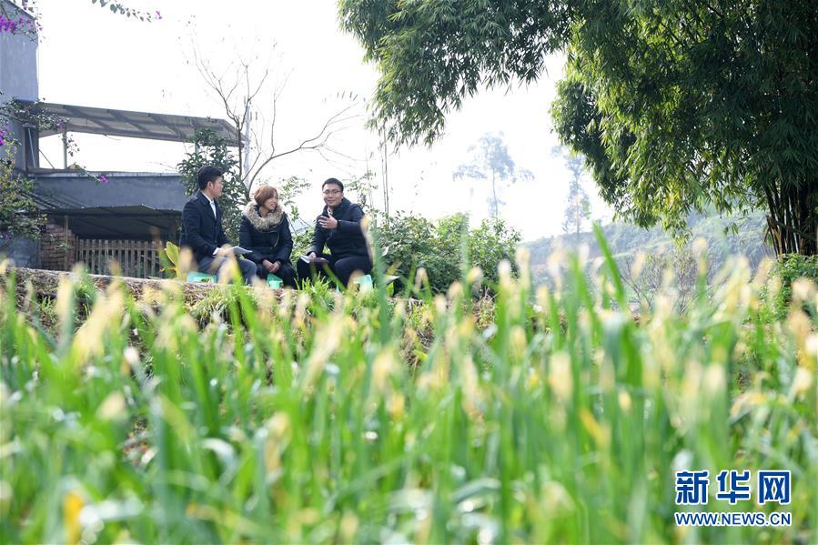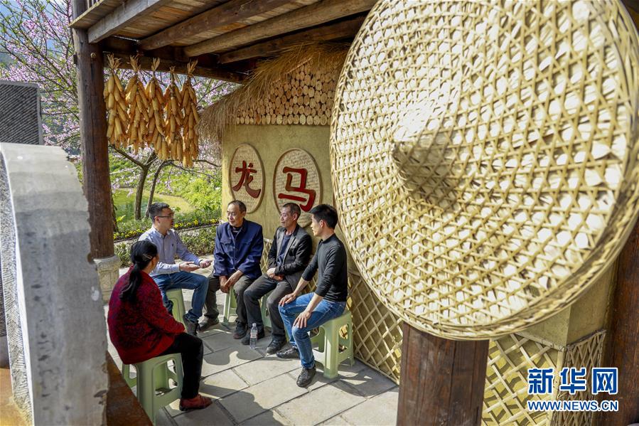 在重庆市武隆区黄莺乡复兴村村史室的院坝里,复兴村第一书记张向东(左二)与党员、返乡创业的村民对村产业发展情况展开交流(2019年3月28日摄)。新华社记者 刘潺 摄