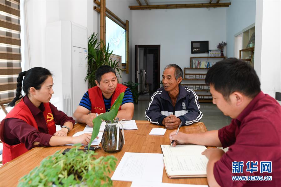 浙江省安吉县报福镇干部周颖(左一)在景溪村接待村民陈云龙(右二),帮助解决门口道路通行不便问题(2019年10月10日摄)。新华社记者 黄宗治 摄