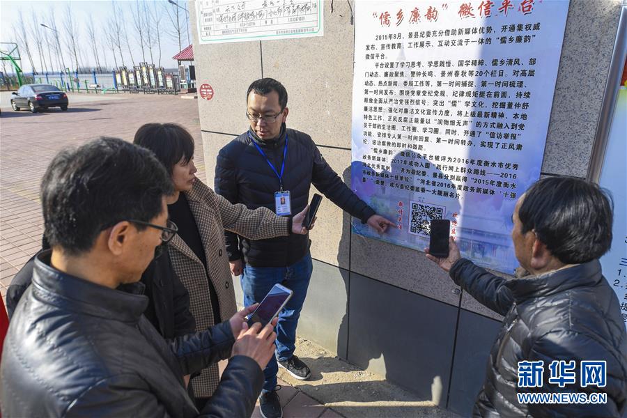 河北省景县纪委监察干部在青兰乡韩堡定村引导群众关注县纪委“儒乡廉韵”微信公众号,了解全面从严治党新形势新要求(2019年12月12日摄)。新华社记者 李晓果 摄