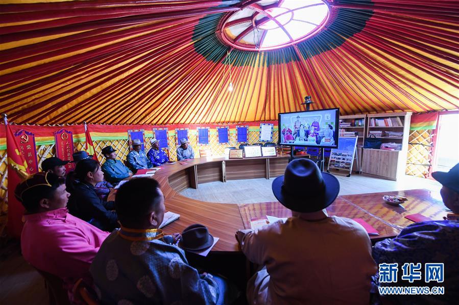 在内蒙古自治区正蓝旗恩克宝力格嘎查党员中心户的蒙古包中,党员在观看学习“人民楷模”都贵玛的先进事迹(2019年10月11日摄)。新华社记者 刘磊 摄