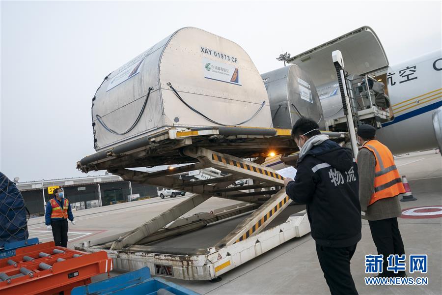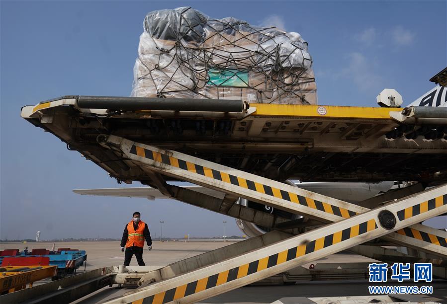 1月29日,在武汉天河机场,工作人员将援助的物资卸下。 新华社记者 熊琦 摄