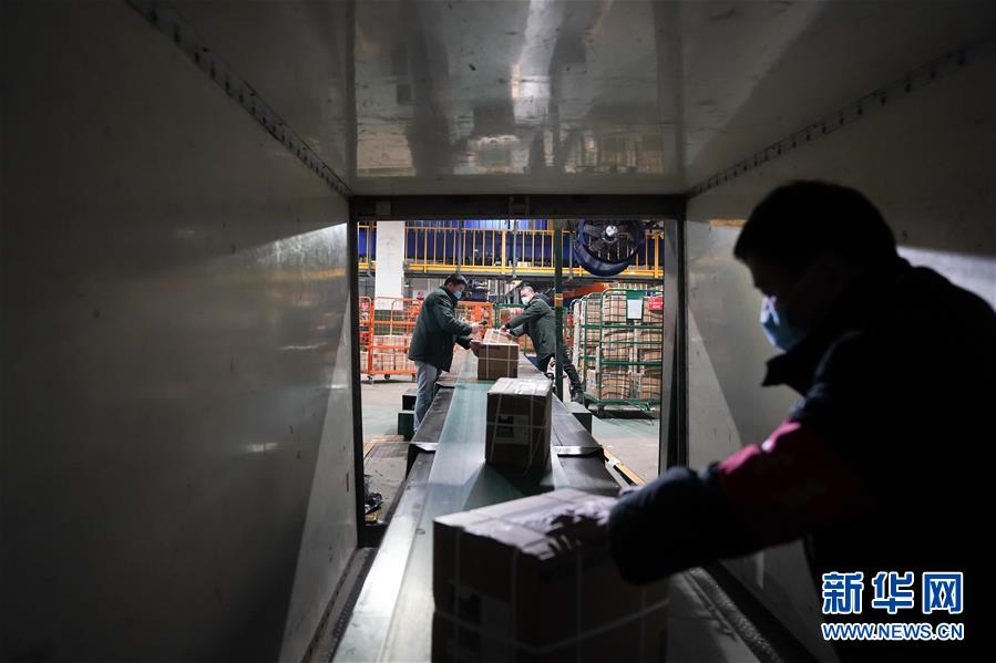 1月27日,武汉邮区中心局邮件处理中心的职工将物资装车,准备运往目的地。 新华社记者 程敏 摄