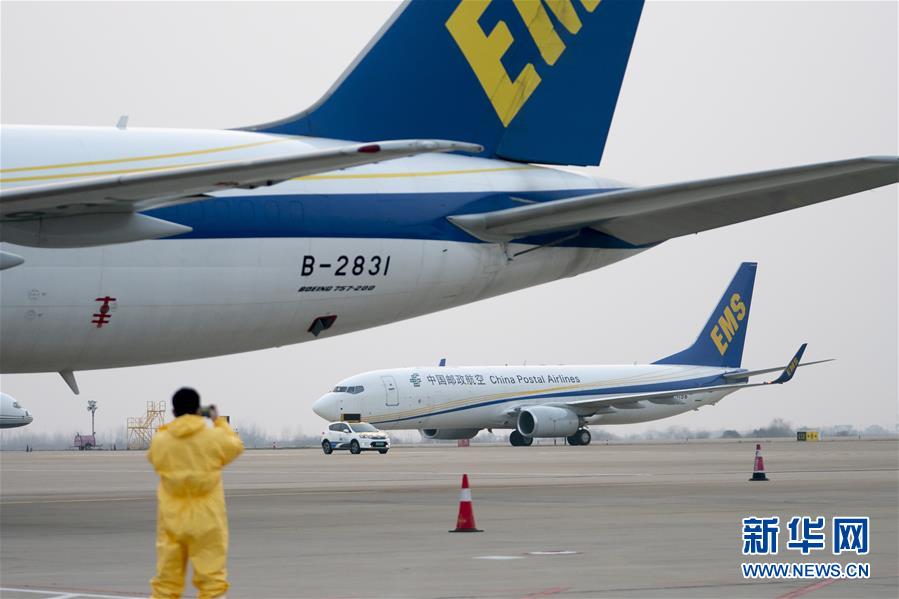 1月29日,一架载满援助物资的中国邮政航空货机降落在武汉天河机场。 新华社记者 熊琦 摄