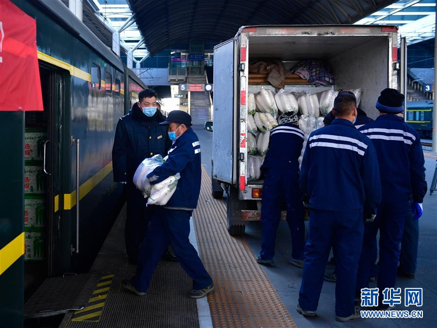 1月30日,中国铁路青藏集团有限公司工作人员在搬运支援武汉的蔬菜。 新华社记者 张龙 摄