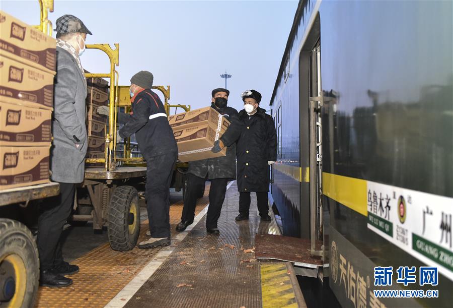 1月26日,在新疆乌鲁木齐,铁路工作人员将援助武汉的物资装车。 新华社发(李维摄)