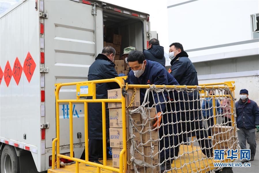 2月1日,在兰州车站,中国铁路兰州局集团有限公司工作人员在搬运援助武汉的疫情防控物资。 新华社发(徐凌波 摄)