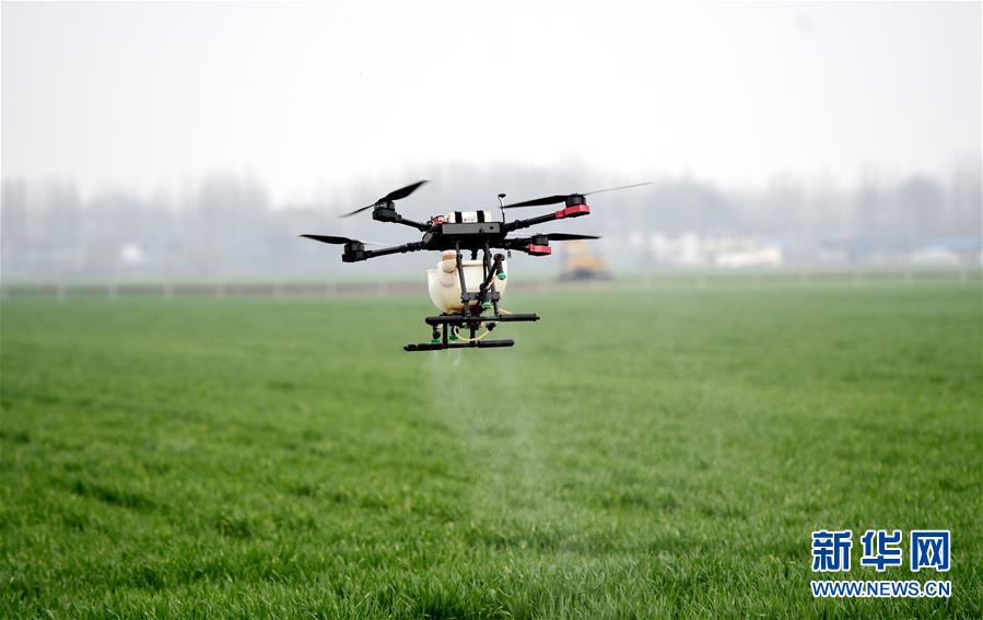 在河南新蔡县余店镇,工作人员使用无人机作业(2月29日摄)。 新华社发 宋超喜 摄