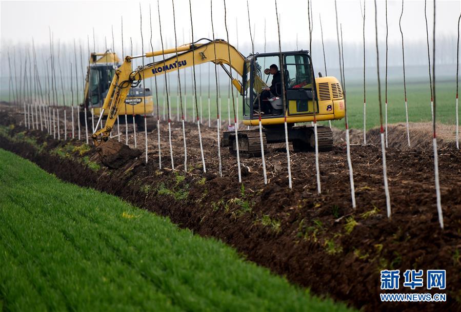 在河南新蔡县余店镇,工作人员使用机械进行高标准农田建设(2月29日摄)。 新华社发 宋超喜 摄