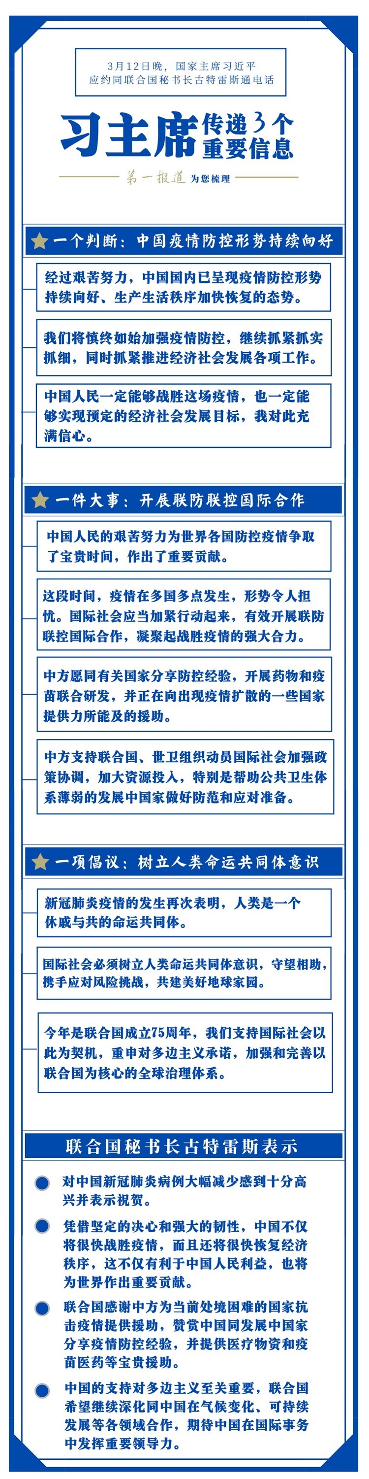 对疫情防控国际合作这件大事,习主席一直十分关心。此前,在内外事活动中,他曾多次提及。这一次同古特雷斯通电话,习主席有更明确阐述。