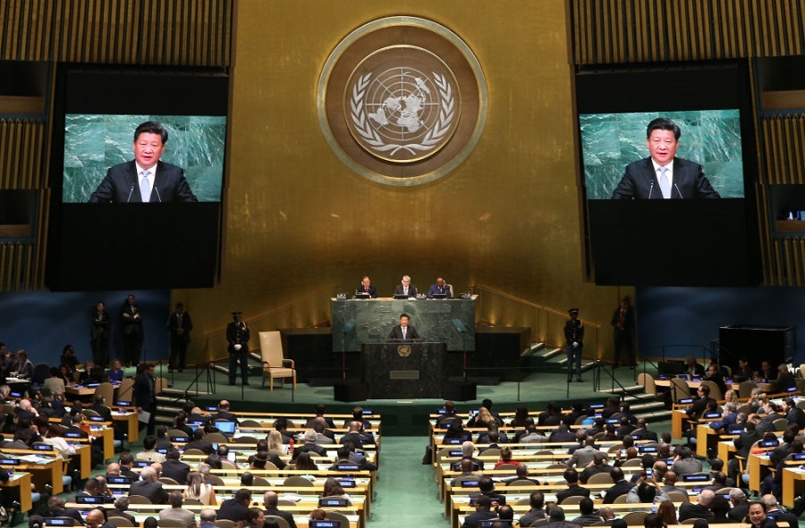 2015年9月28日,国家主席习近平在纽约联合国总部出席第70届联合国大会一般性辩论并发表题为《携手构建合作共赢新伙伴 同心打造人类命运共同体》的重要讲话。新华社记者庞兴雷摄