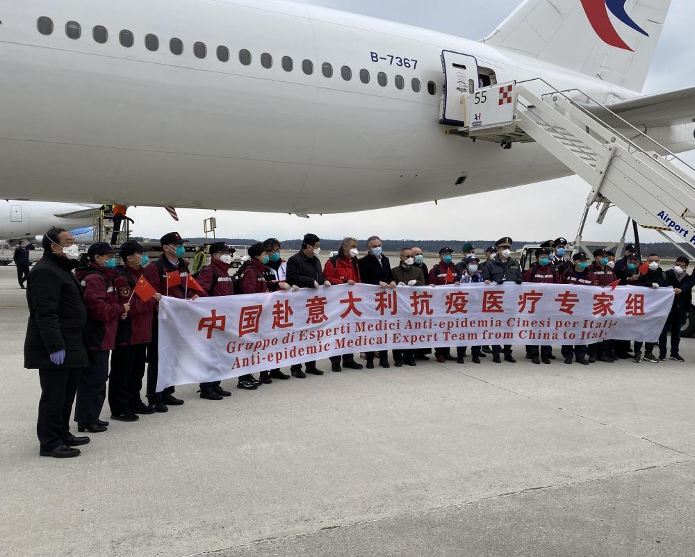 3月25日,在意大利米兰马尔彭萨机场,中国第三批赴意大利抗疫医疗专家组成员与意方人员合影。