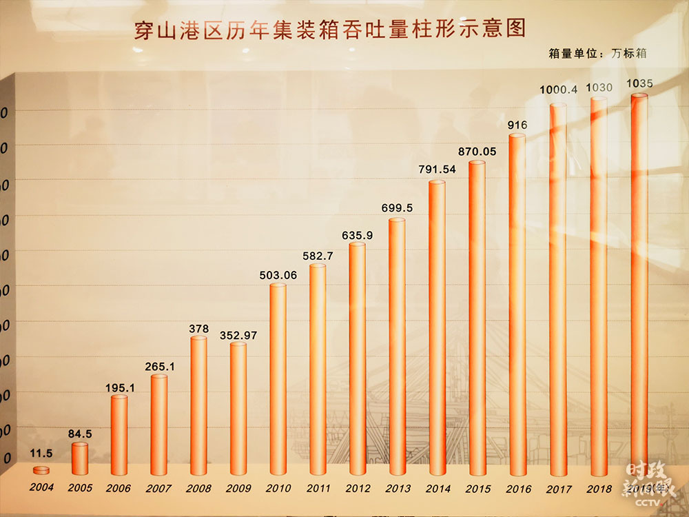 柱形图清晰展示了2004—2019年穿山港区集装箱吞吐量的增长(总台央视记者史伟拍摄)