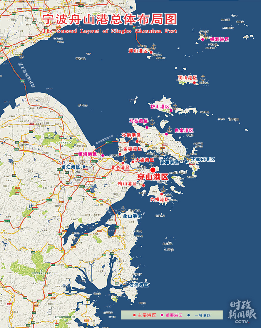 宁波舟山港由北仑、洋山、六横、衢山、穿山、金塘、大榭、岑港、梅山等19个港区组成。这是宁波舟山港总体布局图。(来源于宁波舟山港股份有限公司官网)