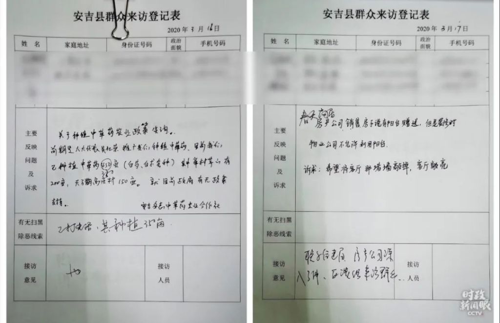 △在群众来访登记表中,能看到村民关于农药政策支持、房屋面积纠纷等问题诉求。(总台央视记者 彭汉明 摄)