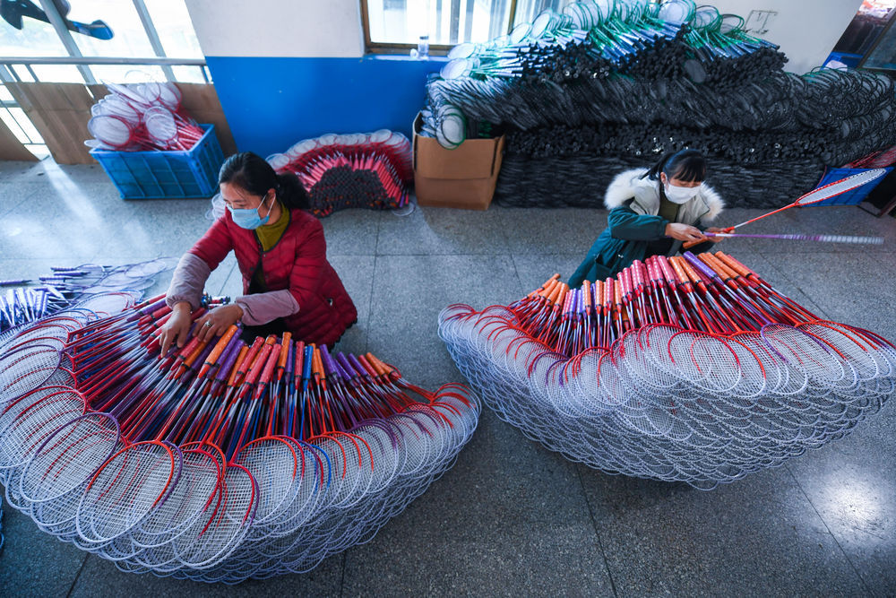 2月20日,在浙江省杭州市富阳区上官乡的浙江博凯文体用品有限公司内,复工的工人在包装成品球拍。新华社记者 徐昱 摄
