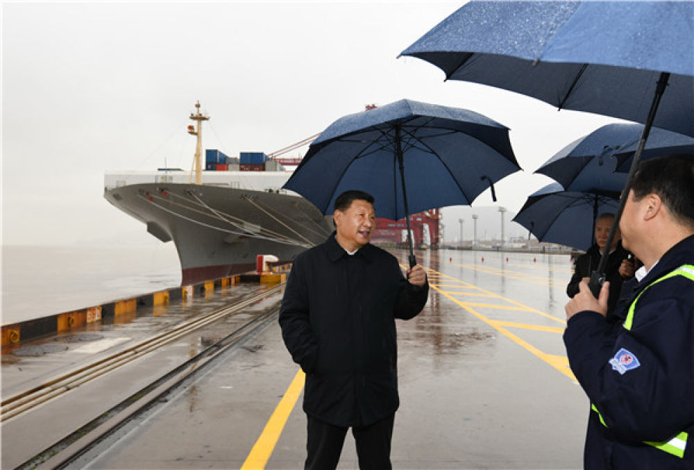 3月29日,习近平在宁波舟山港穿山港区码头了解港口复工复产情况。新华社记者 燕雁 摄