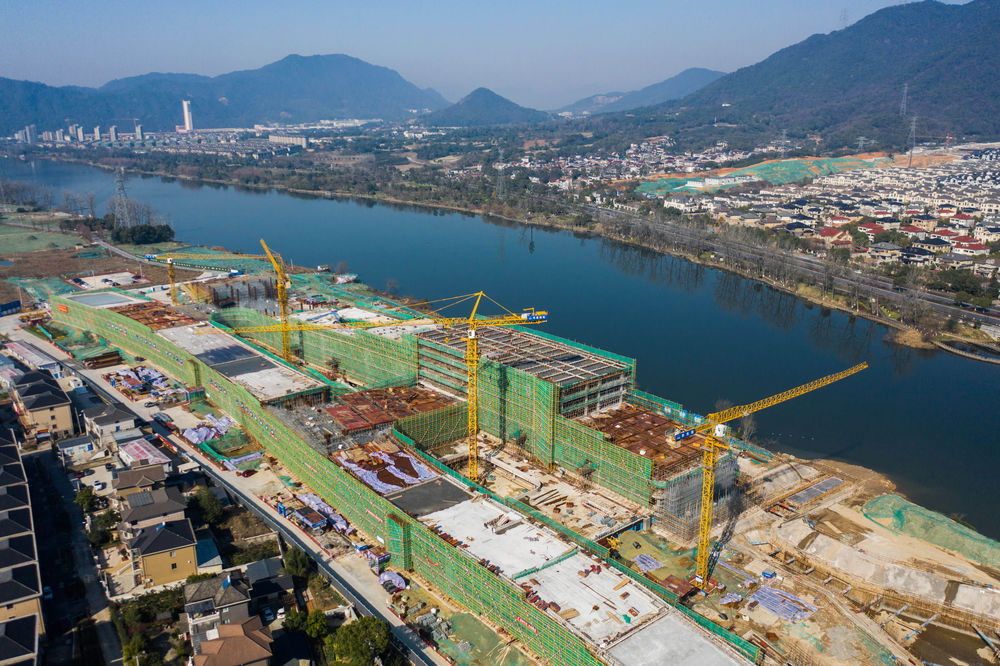 2月20日,位于浙江省杭州市富阳区东洲街道的省重点工程——北支江亚运场馆项目全面复工(无人机照片)。新华社记者 徐昱 摄