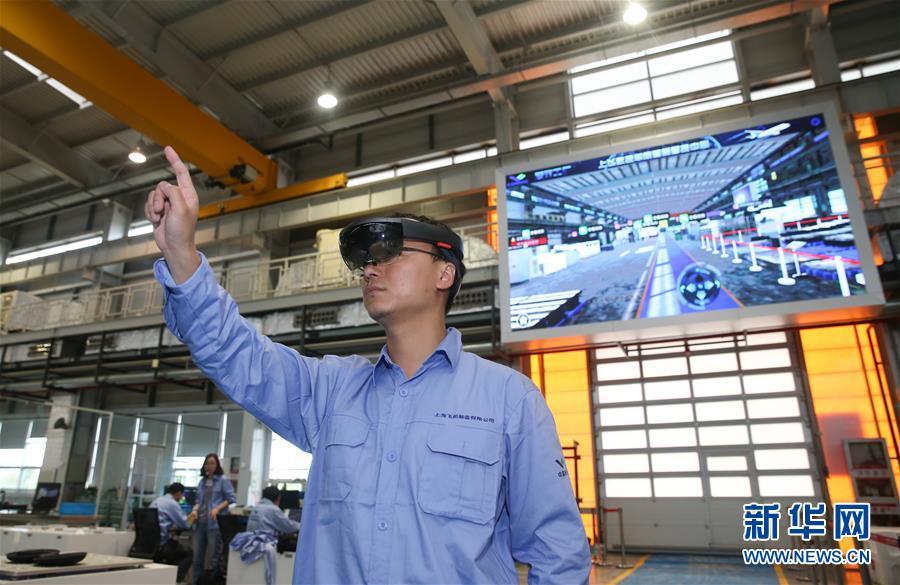 工作人员在中国商飞公司总装制造中心智慧数控车间使用AR眼镜操控虚拟电子屏幕(2018年5月5日摄)。新华社 丁汀 摄