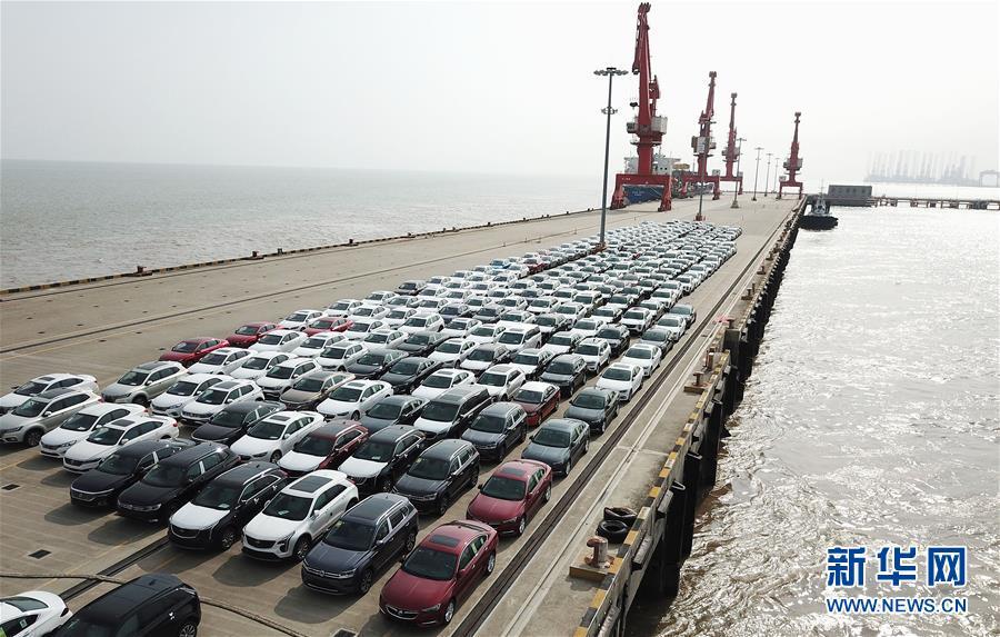 在位于上海临港的上海南港码头,新出厂的汽车等待装船转运(2019年6月27日摄,无人机照片)。新华社 方喆 摄
