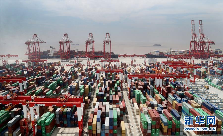 从控制塔中俯瞰上海洋山港四期自动化码头(2018年5月17日摄)。新华社 方喆 摄