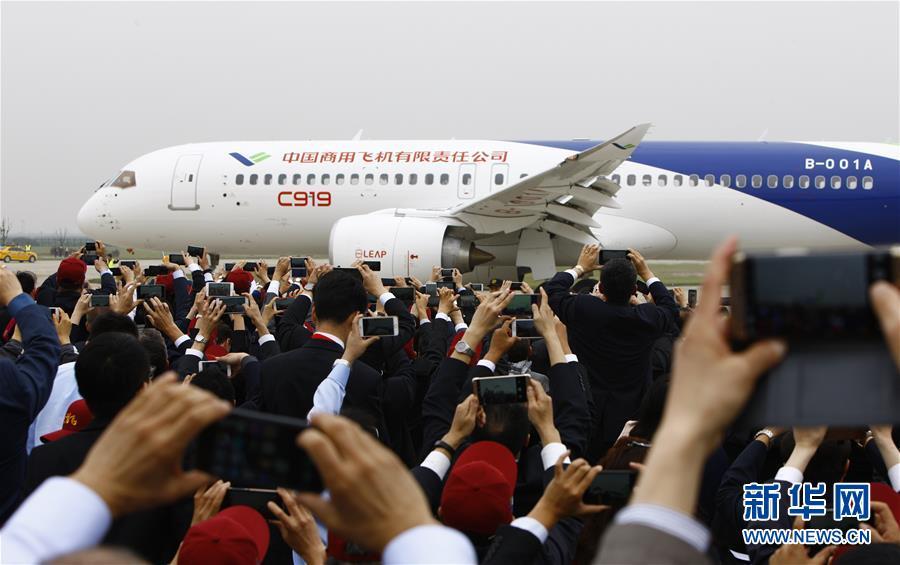 国产大型客机C919在上海浦东国际机场首飞成功(2017年5月5日摄)。新华社 方喆 摄