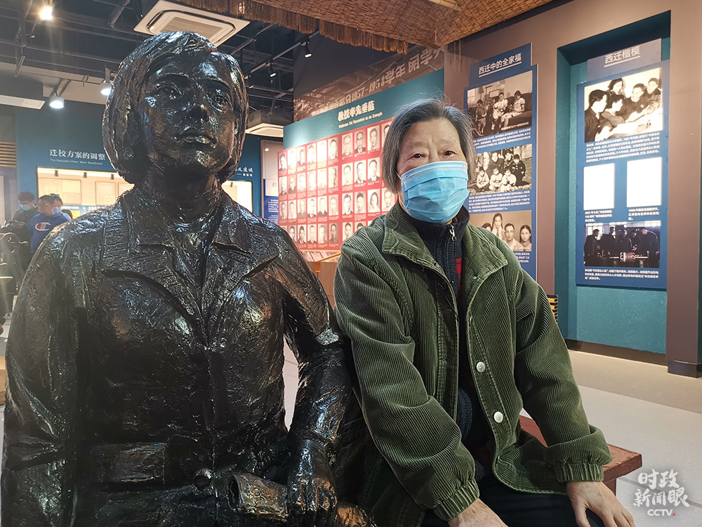 △这位精神矍铄的老教授叫胡奈赛,当年西迁时,她只有22岁。交大西迁博物馆开放后,她一直有个心愿,想跟图左的雕塑合张影。因为雕塑的衣服是仿照西迁时她的衣服样式制作的,实在太有纪念意义。今天,她梦想成真。(总台央视记者王晓东拍摄)