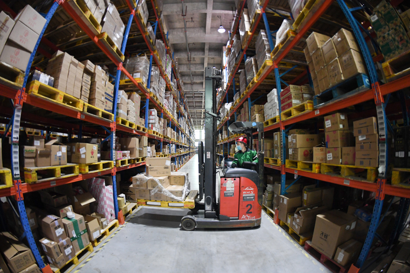 在北京市顺义区菜鸟物流仓库,一名工作人员在摆放货物。一季度,网上会议、线上交易、在线教育等促进信息传输、软件和信息技术服务业增加值同比增长13.2%;实物商品网上零售额同比增长5.9%。