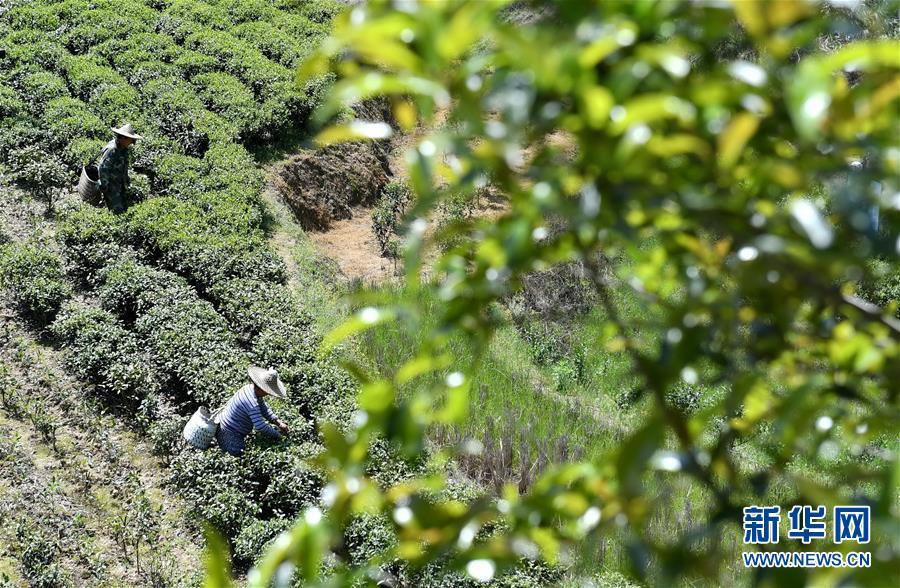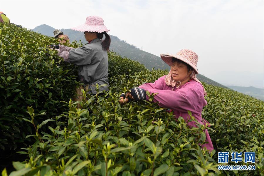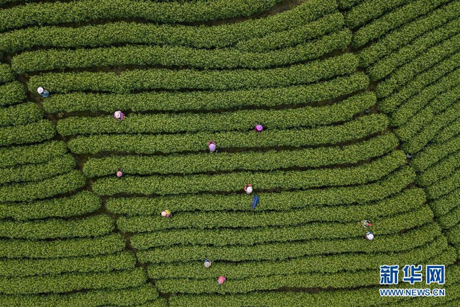 安徽金寨县花石乡大湾村的村民在茶产业扶贫基地里采茶(2020年4月17日摄)。 新华社记者 刘军喜 摄