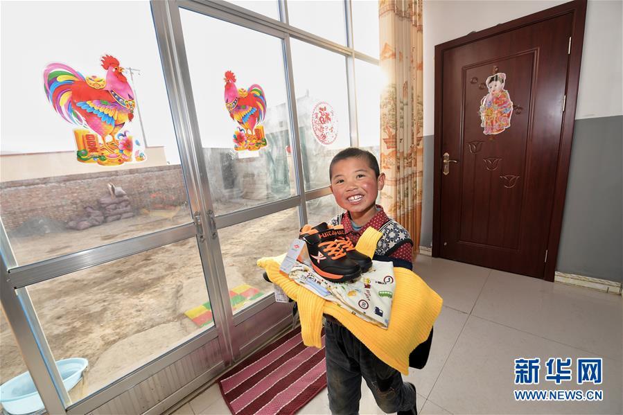 青海互助土族自治县班彦新村的儿童在刚迁入的新居内展示新买的衣服(2017年1月摄)。 新华社记者 吴刚 摄